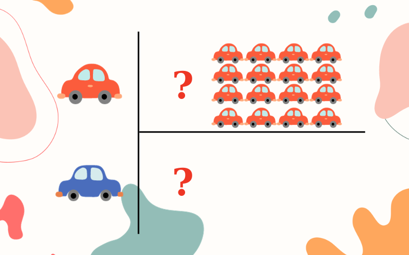 Ví dụ: Tỷ lệ xe màu xanh so với xe màu đỏ trong một bãi đỗ xe là 3:5. Bạn biết xe màu đỏ nhiều hơn xe màu xanh 12 chiếc, làm cách nào để tìm ra số lượng xe màu xanh và đỏ?