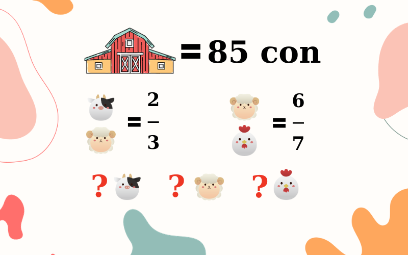 Chia tổng số gia súc (85 con) cho tổng số phần trong tỷ lệ sau khi đã kết hợp: 85 ÷ (2 + 3 + 3) = 85 ÷ 8. Từ đó, bạn biết mỗi phần có 10.625 con.
