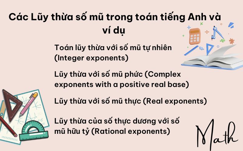 Các Lũy thừa số mũ trong toán tiếng Anh và ví dụ