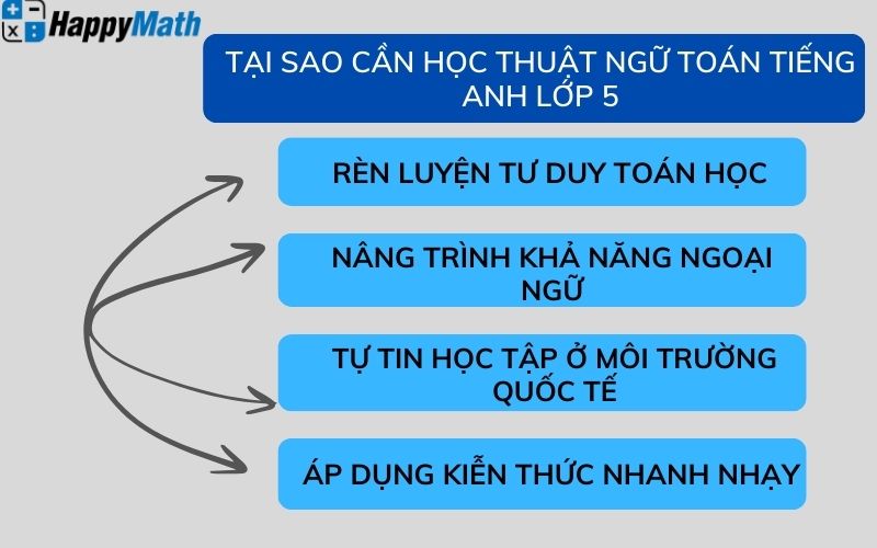 Việc nắm vững các thuật ngữ toán tiếng anh giúp học sinh hiểu sâu hơn về các khái niệm toán học trong tiếng anh, áp dụng một cách chính xác. Bên cạnh đó, điều này còn giúp các em nâng cao trình độ ngoại ngữ của mình. Đăng ký học toán tiếng anh lớp 5 tại Happymath ngay hôm nay để được tư vấn kỹ càng nhất !
